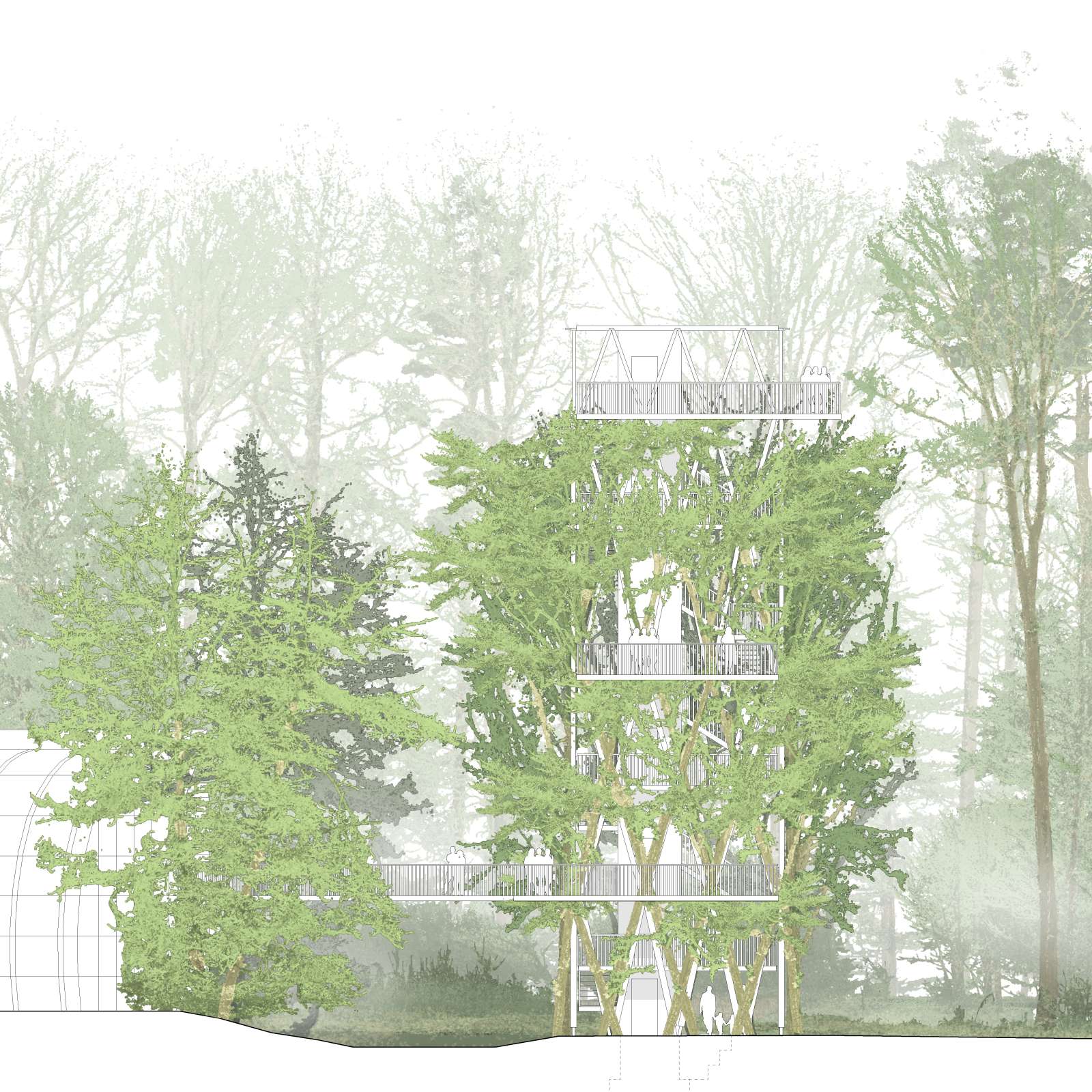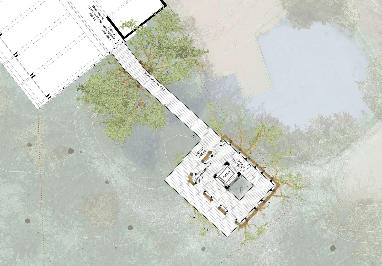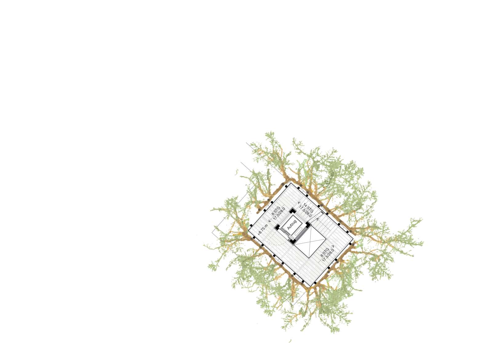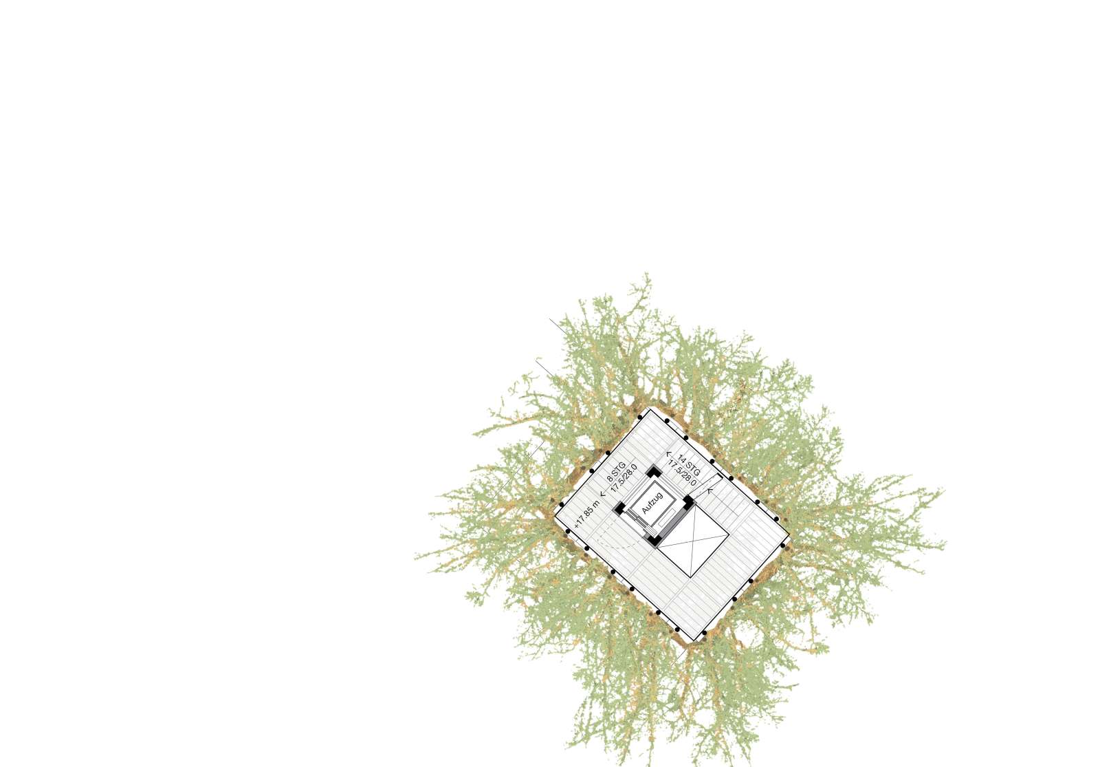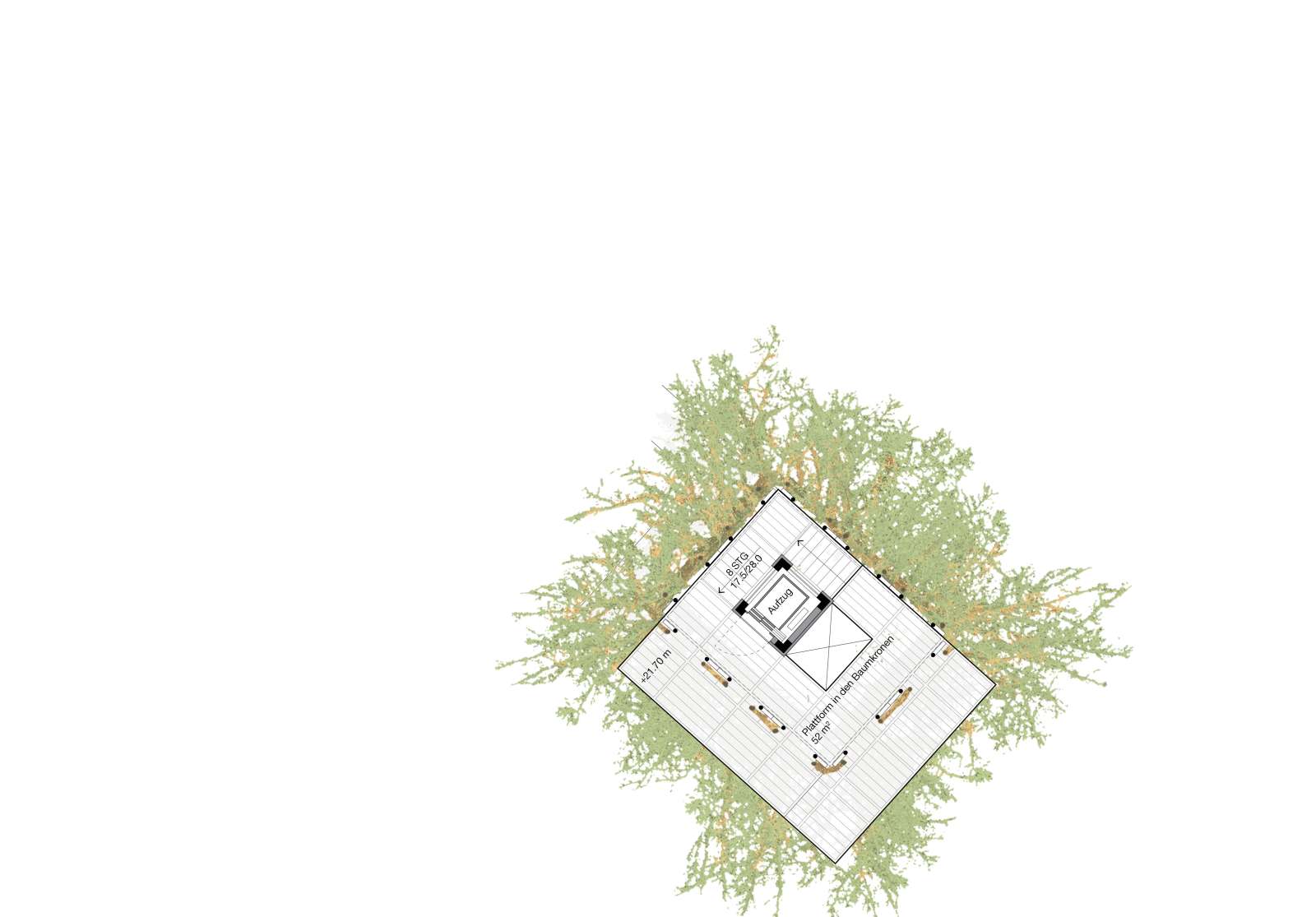 Skizze oberste Ebene mit erwachsen Bäumen (Ebene 21.70m): Blick in die Baumkronen des umliegenden Waldes von der obersten Plattform.