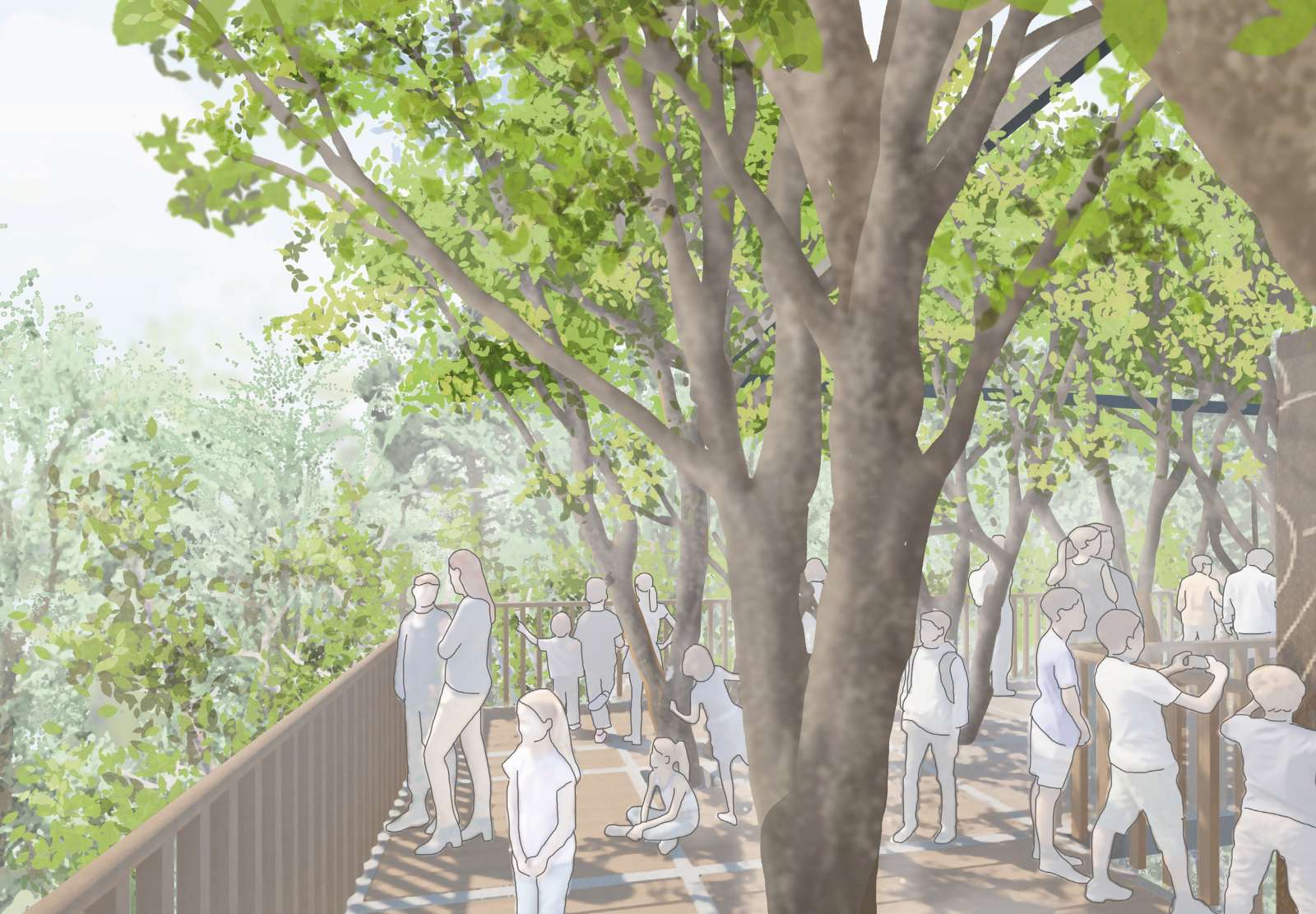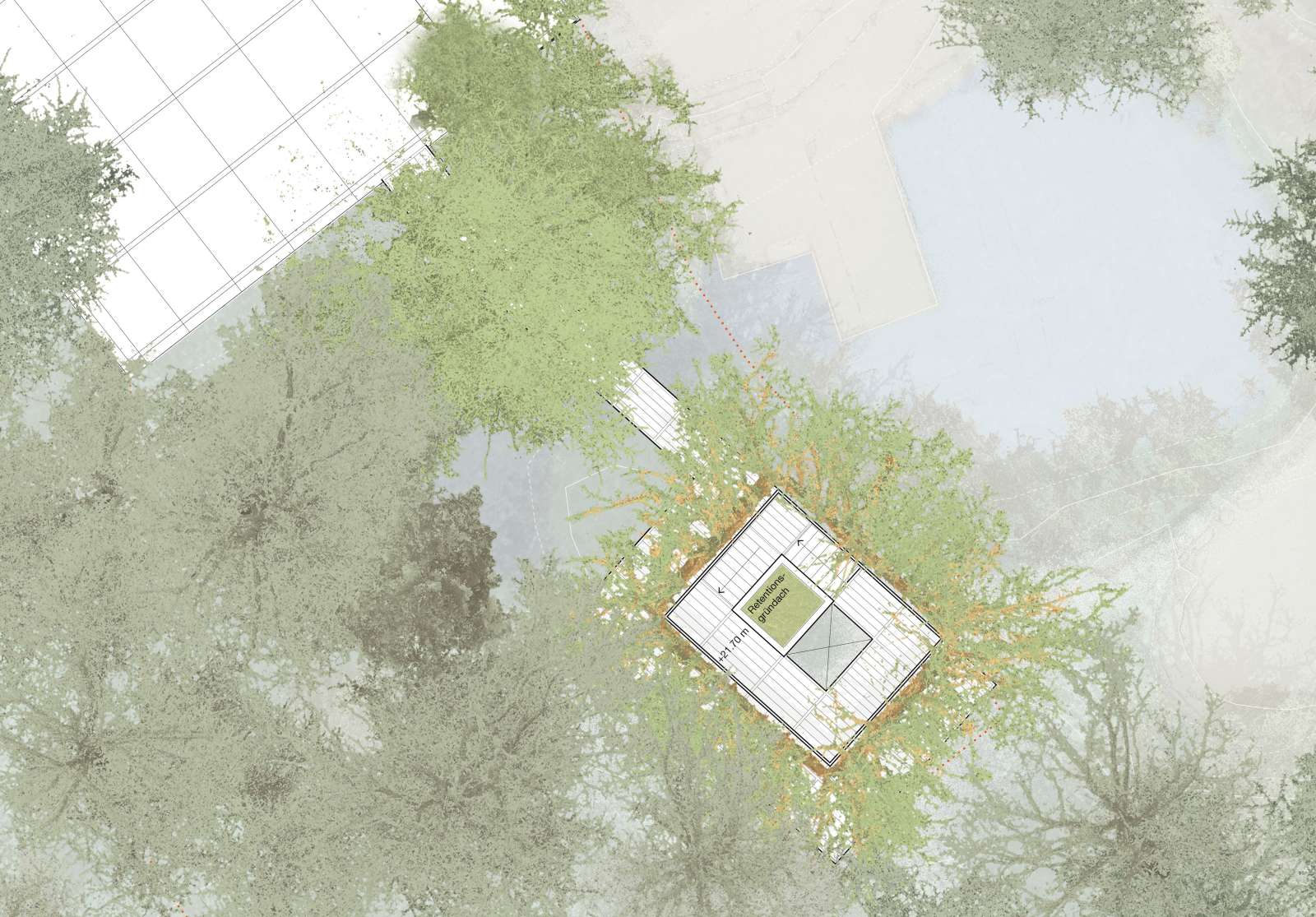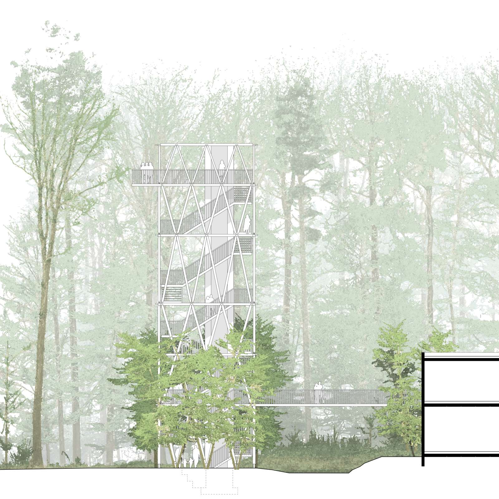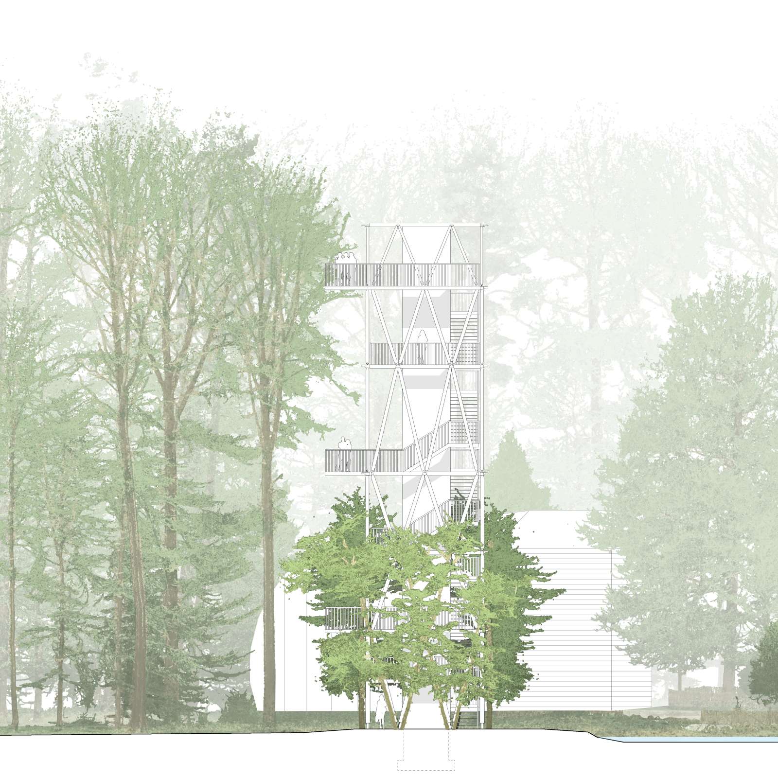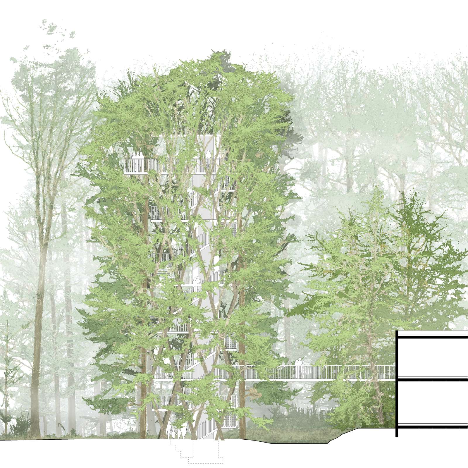 Skizze oberste Ebene mit erwachsen Bäumen (Ebene 21.70m): Blick in die Baumkronen des umliegenden Waldes von der obersten Plattform.