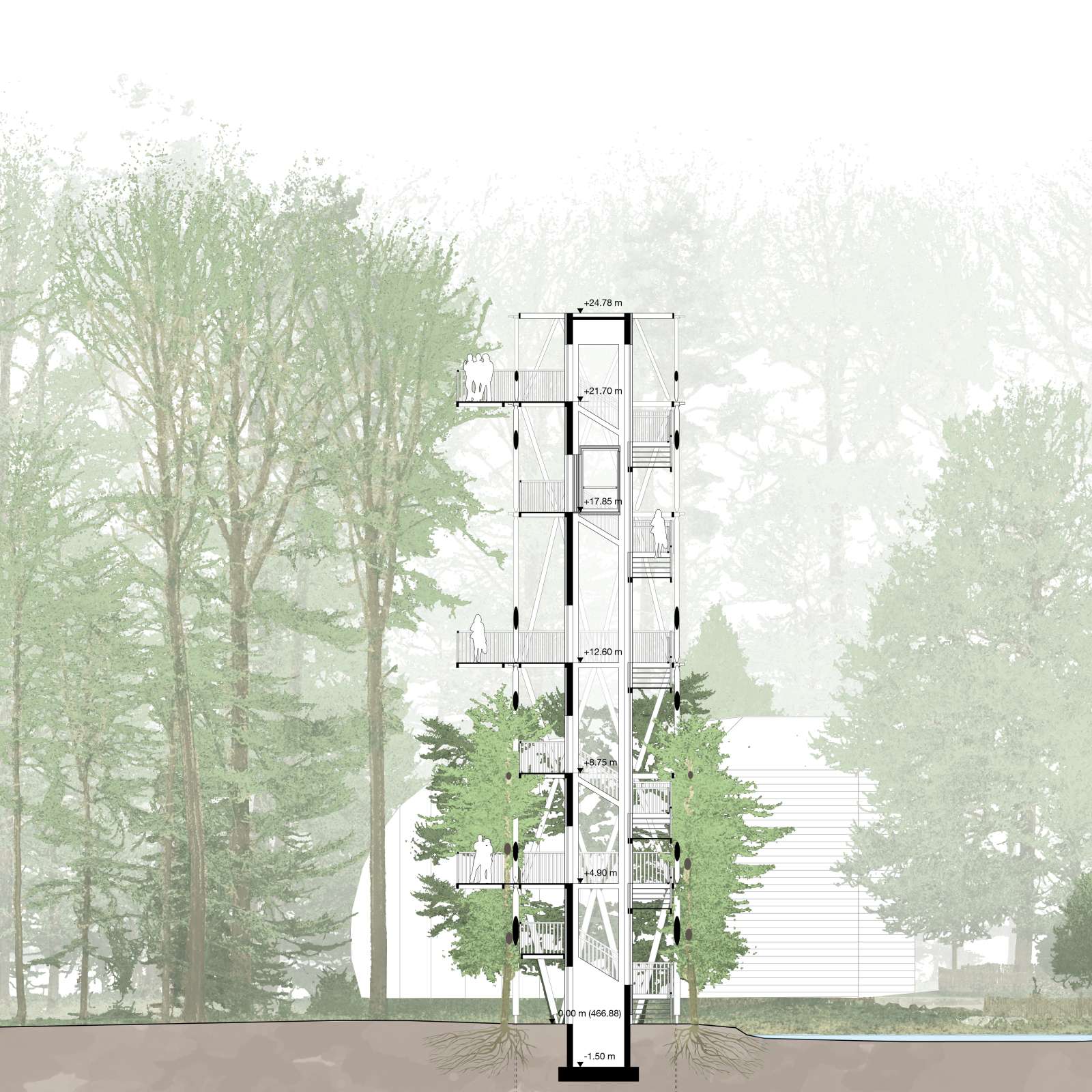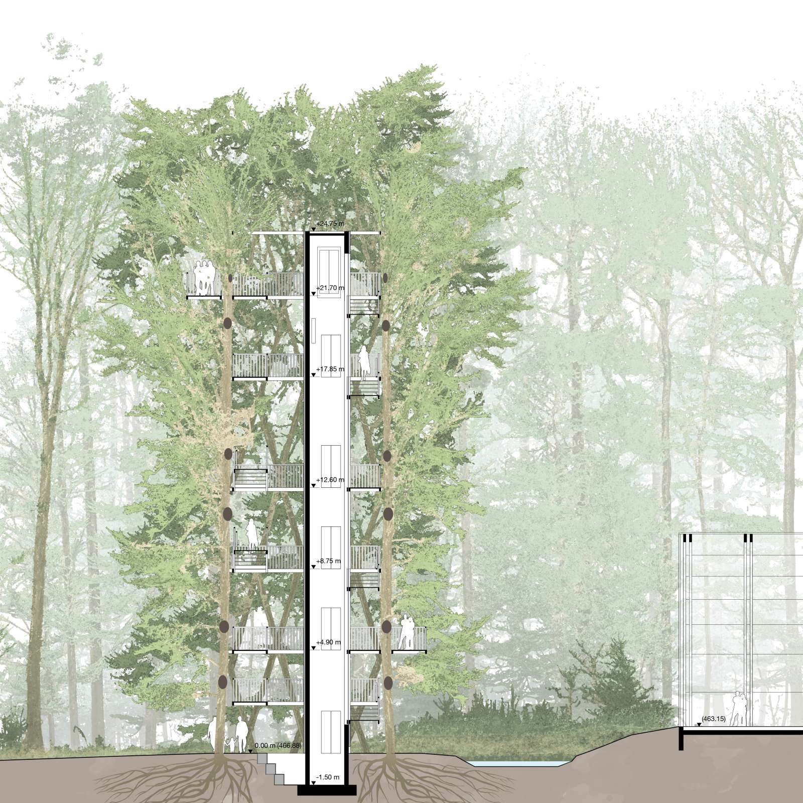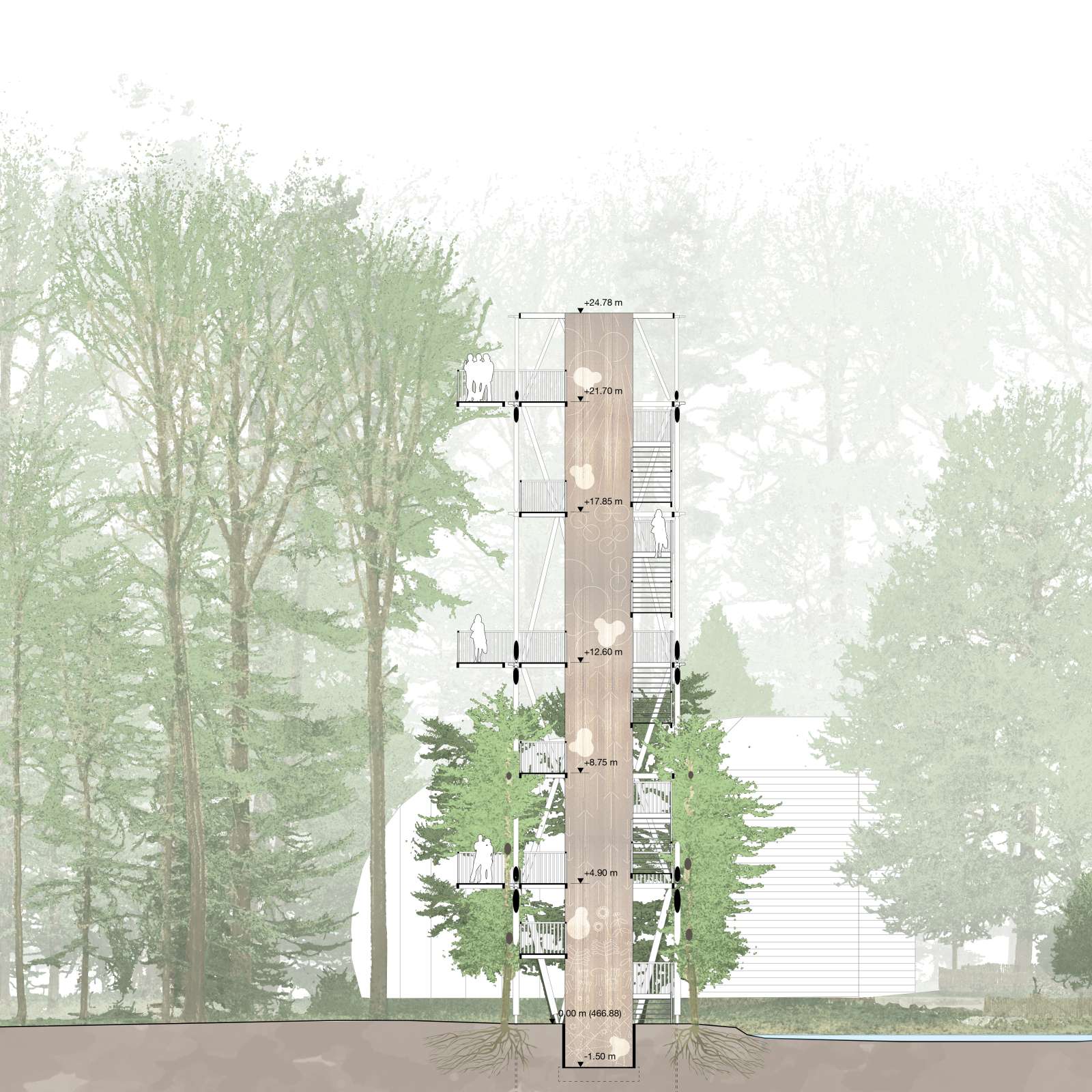 Der Bildungsbaum wird als Bauwerk im Werden verstanden. Er schreibt sich in die zeitlichen Prozesse des Waldes ein und verknüpft ökologische Dynamiken, forstliche Nutzung und architektonische Transformation. Wachsen, Nutzen, Weiterverwenden und in natürliche Kreisläufe Zurückführen werden nicht nur thematisch vermittelt, sondern räumlich und konstruktiv erfahrbar gemacht.