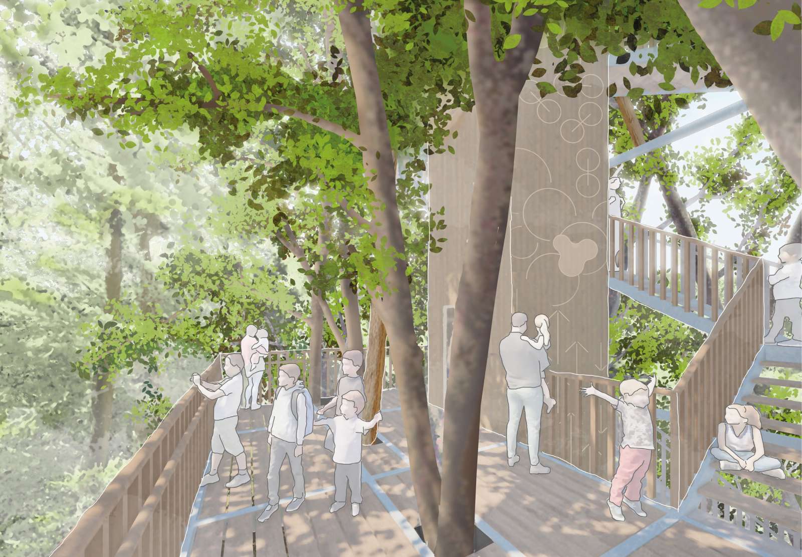 Mehrere offene Themenplattformen führen vom bodennahen Bereich über die Strauch- und Stammzone bis in den lichten Kronenraum und bieten Gruppen von 30 bis 50 Personen Platz. Eine durchlaufende Grafik am Aufzugsschacht erläutert die physiologischen Prozesse des Baumes ebenso wie die klimatischen und ökologischen Unterschiede der einzelnen Höhenstufen. Das Lernen ist damit in die räumliche Erfahrung des Bauwerks eingebunden: Die Besucherinnen und Besucher bewegen sich nicht nur durch Ebenen, sondern durch unterschiedliche Schichten und Lebensbedingungen des Waldes.