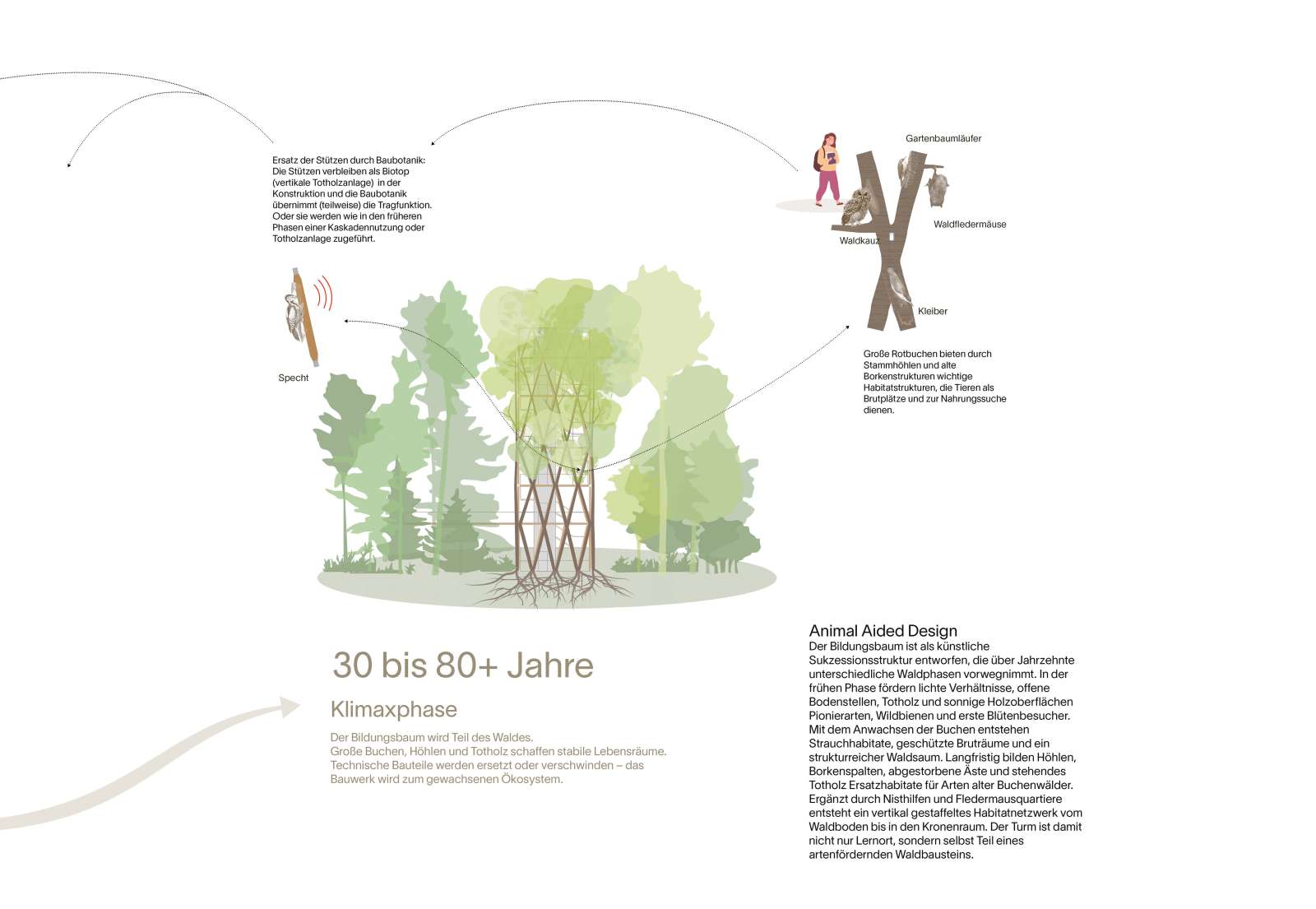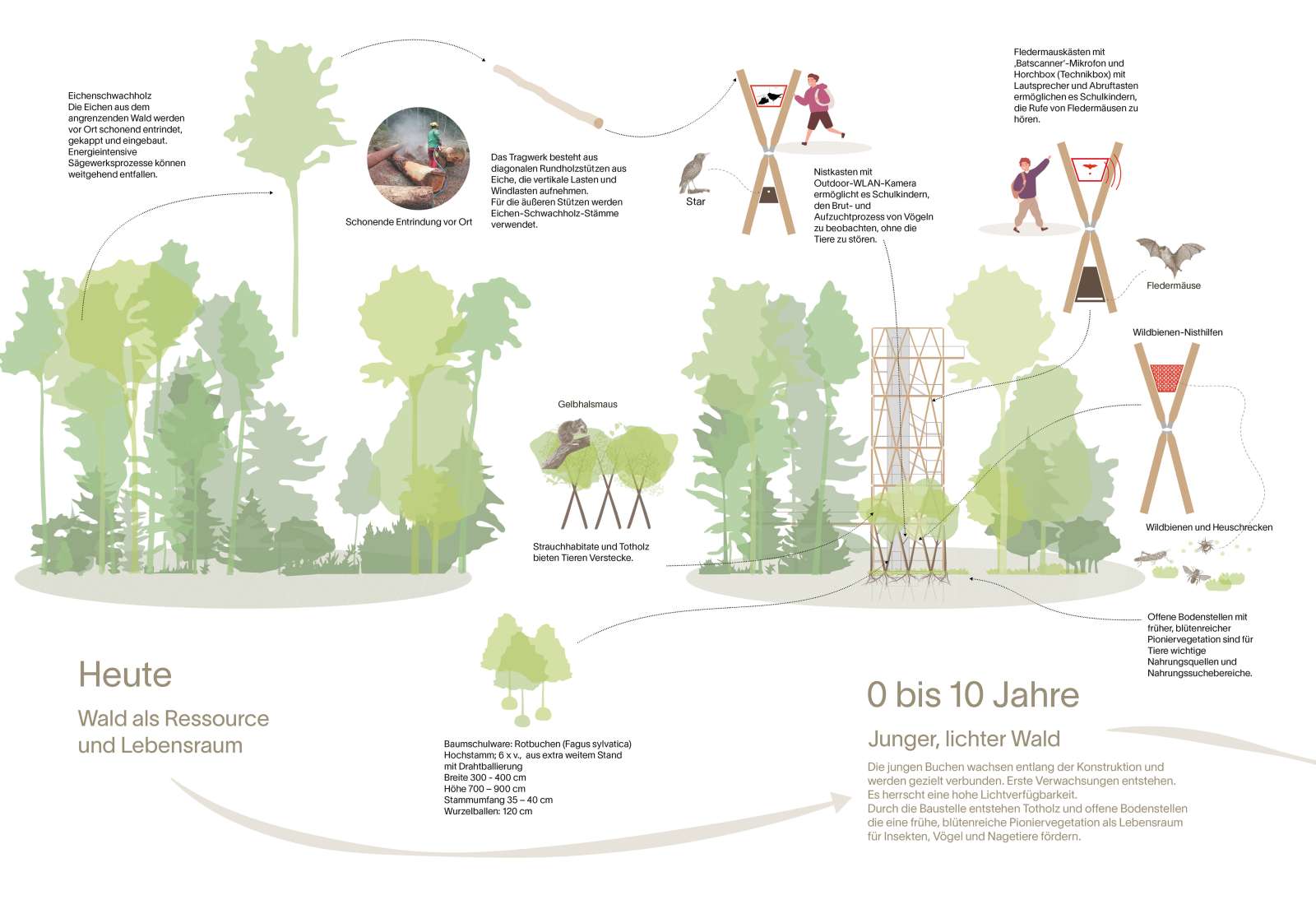 Biodiversität ist von Beginn an als eigenständiges Entwurfsprinzip mitgedacht. In der frühen Phase fördern durch den baulichen Eingriff hervorgerufene lichte Bedingungen, Totholz und offene Bodenstellen erste Pioniervegetation und schaffen Nahrung und Nischen für Insekten und frühe Besiedler. In der Zwischenphase verdichtet sich die junge Buchenstruktur, bildet Strauchhabitate, geschützte Rückzugsräume und neue Brutgelegenheiten. In der späteren Klimaxphase entstehen durch die großen Buchen, Stammhöhlen, Borkenstrukturen und das in der Struktur belassene Totholz dauerhafte Lebensräume für Vögel, Fledermäuse und weitere Waldorganismen. Der Entwurf beschreibt Biodiversität damit als zeitliche Sukzession, die sich mit dem Bauwerk verändert und von Schulklassen über Jahre hinweg beobachtet werden kann.