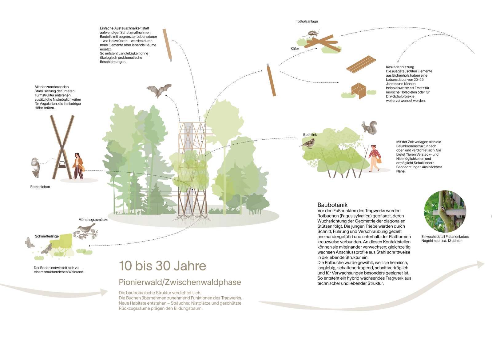 Der baubotanische Ansatz bildet den konzeptionellen Kern des Projekts. Vor den Fußpunkten des Rundholztragwerks werden Rotbuchen gepflanzt, deren Wuchsrichtung der Geometrie der Konstruktion folgt. Durch Schnitt und Führung werden die Triebe entlang der Struktur nach oben geführt und unterhalb der Plattformen miteinander verbunden. So verwachsen sie miteinander und an den Knotenpunkten auskragende Stahlelemente wachsen schrittweise in die lebende Konstruktion ein. Auf diese Art entsteht über die Jahre eine lebende Ergänzung des Tragwerks, die Wachstum sichtbar macht und perspektivisch auch konstruktiv wirksam werden kann. Die äußeren diagonalen Holzstützen sind dabei bewusst nicht als dauerhaft geschützte Bauteile, sondern als austauschbare, der Witterung ausgesetzte Begleiter einer lebenden Tragstruktur gedacht. Sie können einzeln durch neue Stützen ersetzt oder langfristig – sobald die baubotanische Struktur die nötige Tragfähigkeit erreicht – von lebendem Holz abgelöst werden. Die Zeitlichkeit des Waldes wird damit nicht nur erzählt, sondern in die Konstruktion selbst eingeschrieben. Für die Besucherinnen und Besucher wird der Bildungsbaum zu einem anschaulichen Lehrstück über Wachstum, Pflege, Zeit und Materialkreisläufe.